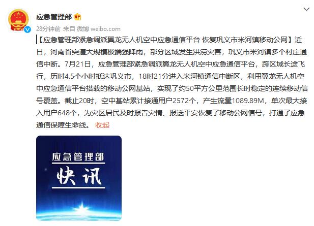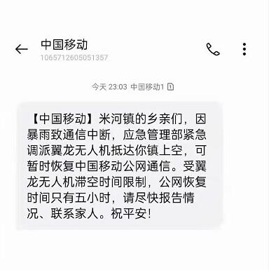 7月21日晚间,不少在河南米河镇的用户收到了中国移动发出的一条短信。短信内容是:米河镇的乡亲们,因暴雨致通信中断,应急管理部紧急调派翼龙无人机抵达你镇上空,可暂时恢复中国移动公网通信。受翼龙无人机滞空时间限制,公网恢复时间只有五小时,请尽快报告情况、联系家人。祝平安!