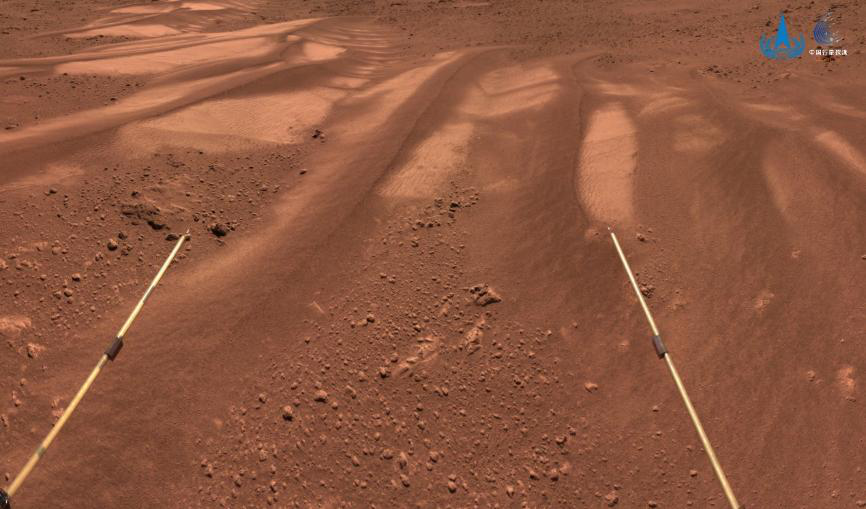 2021年5月22日10时40分,“祝融号”火星车驶达火星表面,开始在轨测试和巡视探测,先后传回“着陆点全景”、“地形地貌”、“中国印迹”和“着巡合影”等影像图。
