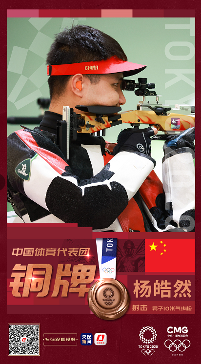 7月25日,在东京奥运会男子10米气步枪决赛中,盛李豪以250.9的成绩夺得银牌,杨皓然以229.4的成绩为中国队收入一枚铜牌。
