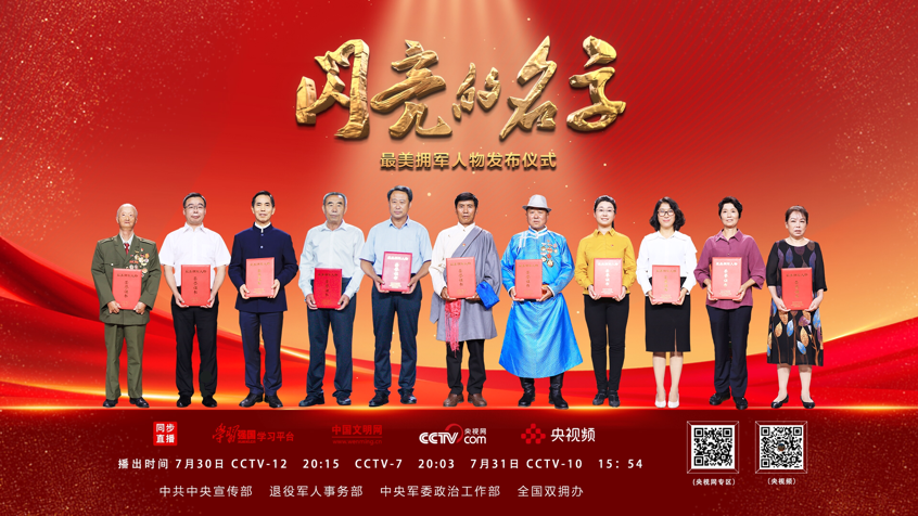 中央广播电视总台将于2021年7月30日在国防军事频道(CCTV-7) 20时03分,社会与法频道(CCTV-12)20时15分,7月31日在科教频道(CCTV-10)15时54分播出“闪亮的名字——最美拥军人物发布仪式”。中国文明网、学习强国、央视网、央视频同步直播。