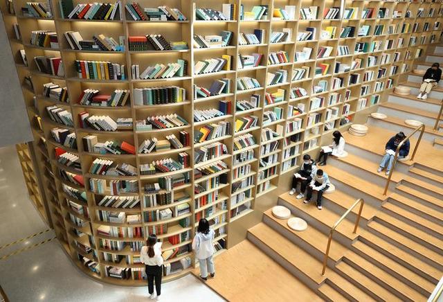 2021年5月2日,读者在安徽省蒙城县图书馆天梯书架旁阅读书籍。新华社发(胡卫国 摄)