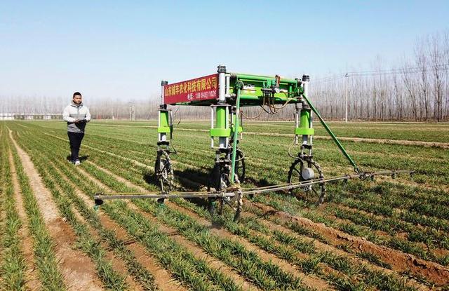 山东省邹平市粮食提质增效关键技术攻关项目明集镇解家村基地,农民操作植保机器人管护麦田(2月22日摄)。新华社发(董乃德 摄)