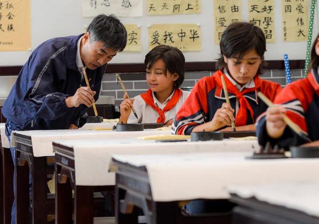 在新疆疏附县托克扎克镇中心小学书法教室内,王庄铁老师在教同学们写毛笔字(2017年9月26日摄)。新华社记者 赵戈 摄