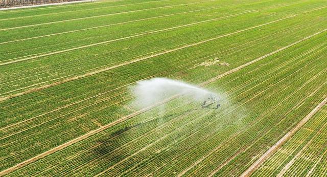 山东省邹平市粮食提质增效关键技术攻关项目明集镇解家村基地,节水喷灌设备在浇灌小麦(2月22日摄,无人机照片)。新华社发(董乃德 摄)