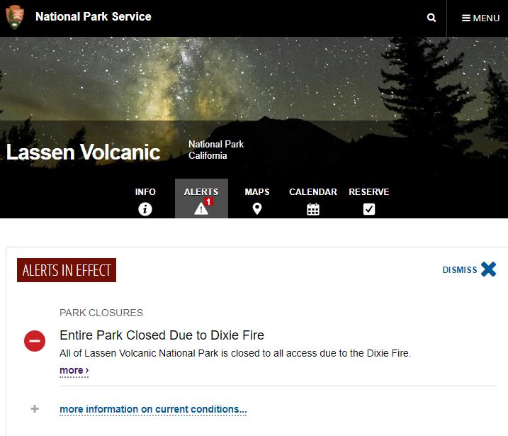 据公园官网的说明通知,目前山林大火仍在公园东侧蔓延,拉森火山国家公园自8月5日起全面处于关闭状态,只允许消防人员进入。