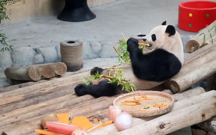在江苏省南通市,南通森林野生动物园的大熊猫在享受“生日大餐”。