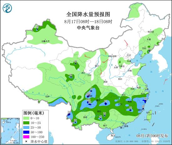 中央气象台预计,今天新疆北疆北部、西藏东南部、江南大部、湖北南部、西南地区东部和南部、华南北部等地部分地区有中到大雨,其中,江西南部、浙江南部、福建东部、四川盆地西部、贵州东北部、云南东北部和西南部等地部分地区有暴雨或大暴雨(100~160毫米)。