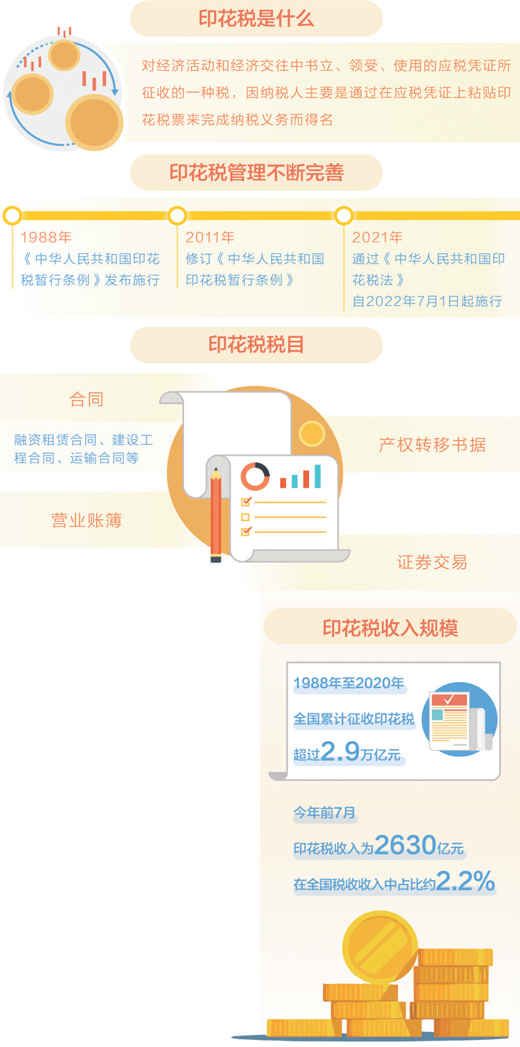 数据显示,今年前7月,印花税收入为2630亿元,在全国税收收入中占比约2.2%。从规模看,印花税是一个小税种。不过,它的作用并不小。印花税实行自行贴花纳税,也有助于培养企业和居民自觉纳税意识,增强税收法治观念。