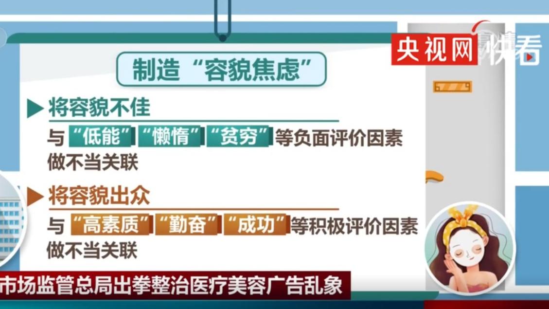 央视网消息:所谓制造“容貌焦虑”,就是将容貌不佳与“低能”“懒惰”“贫穷”等负面评价因素做不当关联,或者将容貌出众与“高素质”“勤奋”“成功”等积极评价因素做不当关联。在狂轰滥炸的虚假宣传下,你“容貌焦虑”了,医美机构赚钱的机会就来了。