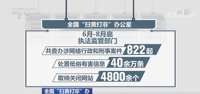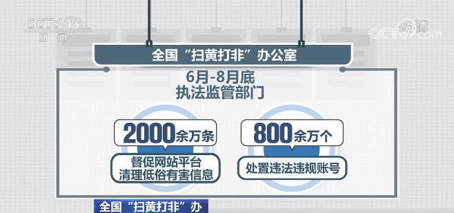 六部门集中力量协同作战,着重整治网上历史虚无主义、涉黄涉非、涉低俗等有害信息,深度清理有悖社会主义核心价值观的网络内容。据不完全统计,6月—8月底,执法监管部门共查办涉网络行政和刑事案件822起,处置低俗有害信息40余万条,取缔关闭网站4800余个;督促网站平台清理低俗有害信息2000余万条,处置违法违规账号800余万个。