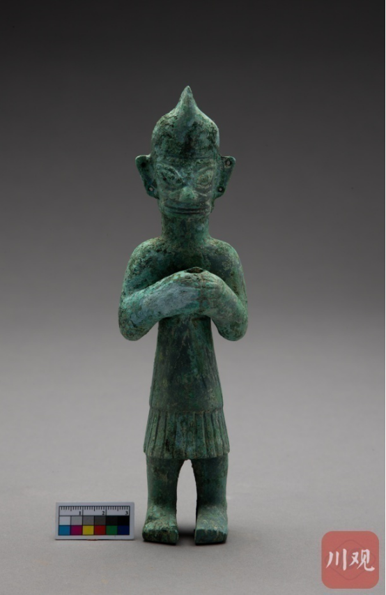 在三星堆3号坑的中部和南部又各发现了一件相同造型的铜立人,年轻的考古人干脆直接称其为“奥特曼”。