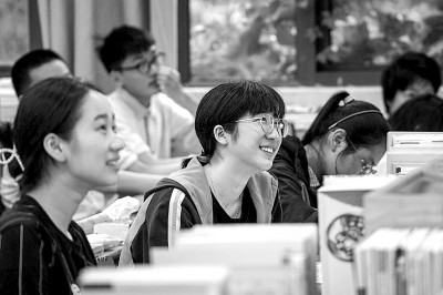 山东省高密市第五中学学生在花丛中阅读交流。光明图片
