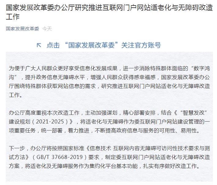 正在阅读:国家发改委:研究推进门户网站适老化与无障碍改造工作