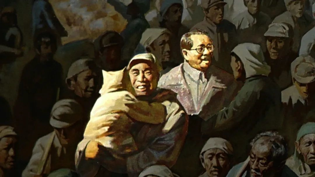 朱德和任弼时位于同一个区域,朱德抱起小孩儿,慈祥地微笑,孩子背部的黄色衣服提亮了画面,任弼时同志的服饰也成为一个有辨识度的体貌特征。