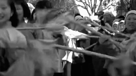 周恩来位于画面的左部,他与老乡之间真切的身体语言的互动,形成了一种情感的联结。
