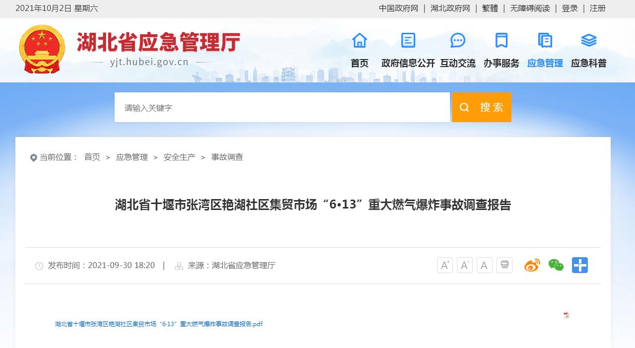 9月30日,湖北省应急管理厅官方网站发布了《湖北省十堰市张湾区艳湖社区集贸市场“6·13”重大燃气爆炸事故调查报告》,事故调查组认定,这起重大燃气爆炸事故是一起重大生产安全责任事故。