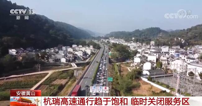 1日,安徽黄山境内的杭瑞高速提前迎来车流高峰,日车流量激增到4万多辆,交通通行趋于饱和。由于车流量很大,交警部门临时关闭了朱村服务区。