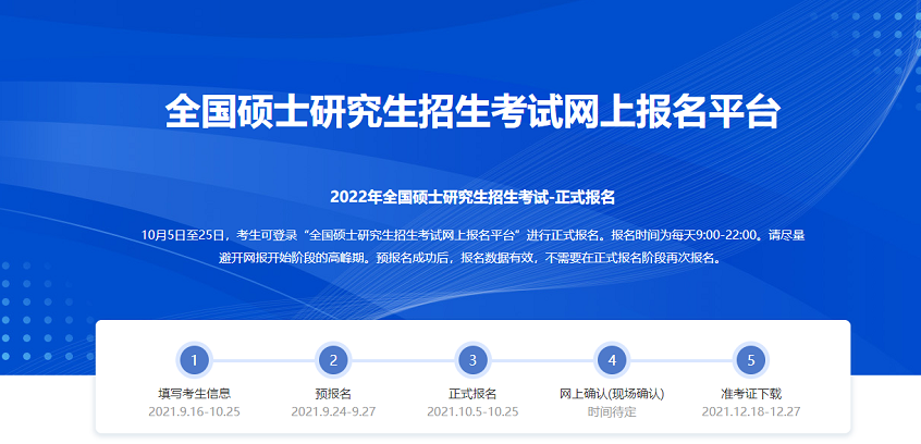 今天(10月5日)起至25日,2022年全国硕士研究生招生考试进入正式报名阶段。每天9:00-22:00,考生可登录“全国硕士研究生招生考试网上报名平台”进行正式报名。