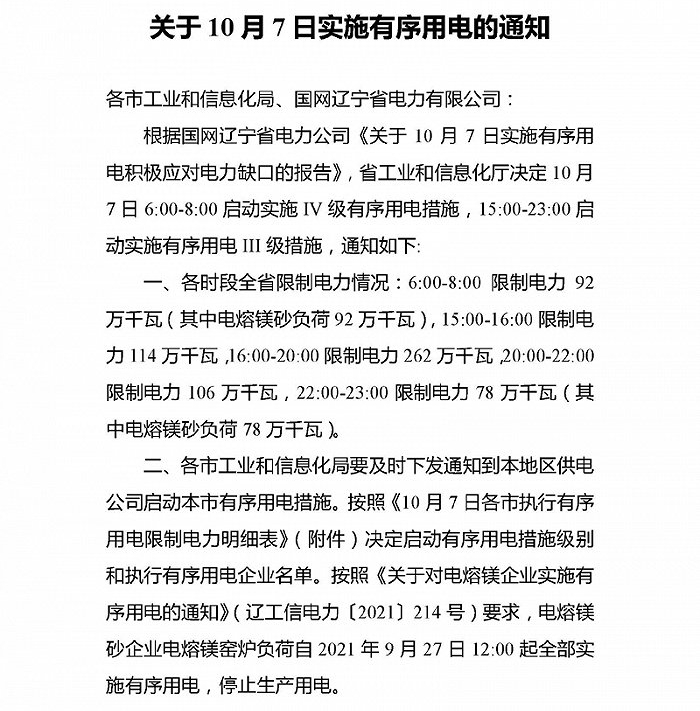 :10月7日,辽宁省工信厅网站发布实施有序用电的通知提出,10月7日6:00-8:00全省启动实施有序用电Ⅳ级措施,15:00-23:00启动实施有序用电Ⅲ级措施。