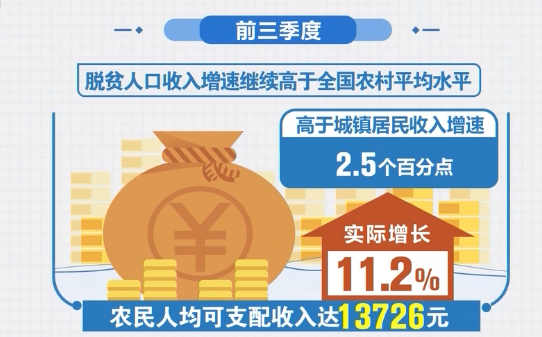 前三季度,农民收入实现较快增长,人均可支配收入达13726元,实际增长11.2%,高于城镇居民收入增速2.5个百分点。脱贫人口收入增速继续高于全国农村平均水平。