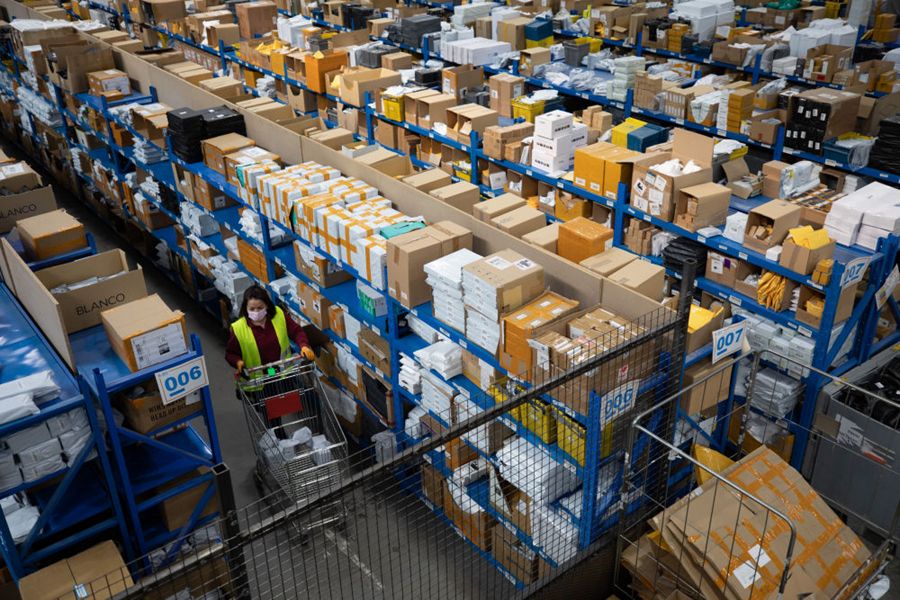 ↑2020年11月11日,工作人员在西班牙瓜达拉哈拉市的菜鸟海外仓分拣商品。“双十一”带动西班牙线上消费新热潮。