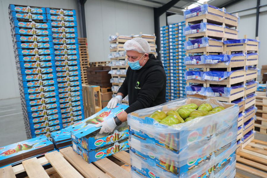 ↑2021年10月22日,工作人员在比利时圣希利斯-瓦斯市的一个水果分拣包装车间将即将出口的比利时啤梨装箱。 比利时的朱樱红啤梨将在第四届中国国际进口博览会上与中国消费者见面,进入中国市场。