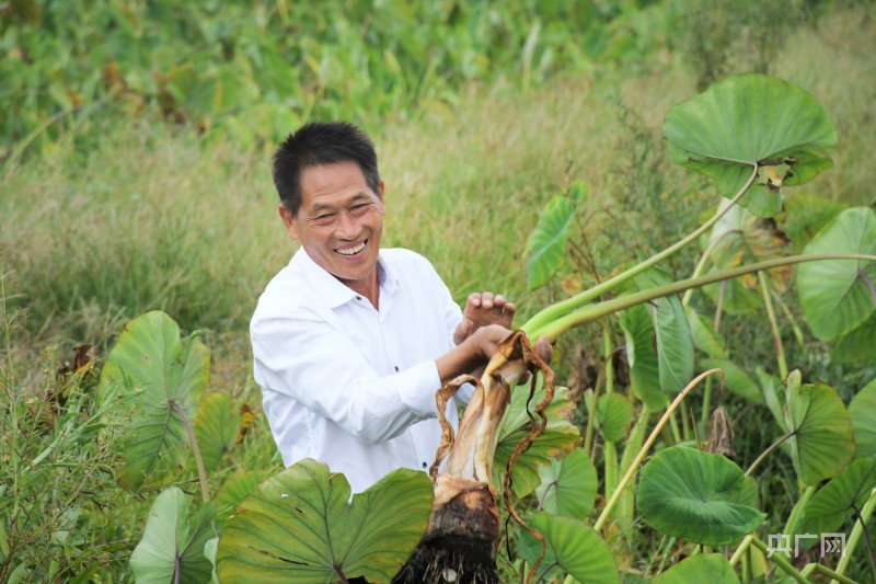 俞邦村村民俞广清在槟榔芋种植地 (央广网记者 龚雯摄)