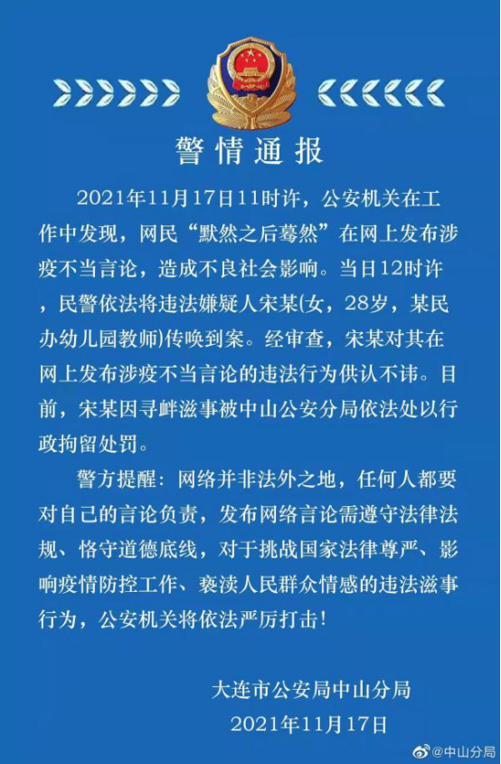 ·女幼师发文“希望大连疫情越多越好”,因涉嫌寻衅滋事已被行政拘留。目前,幼儿园已经对其做出开除决定。