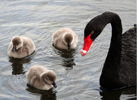 北京圆明园遗址公园后湖景区内,黑天鹅妈妈看护三只小宝宝在水面上玩耍。