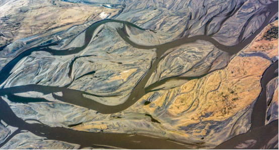 随着黄河水位的下降,山西省运城市万荣县境内黄河河道上的河床大面积裸露。从空中俯瞰,河床上被水流冲刷出无数形态各异、粗细不等的蜿蜒曲线,显现出一幅幅美丽的图案。