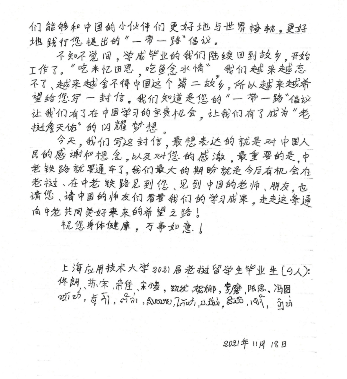 这封来信是上海应用技术大学铁道工程专业的第一届老挝留学生联合书写的。9名同学今年全部顺利毕业,成为中老铁路通车后的第一批工程技术人员。