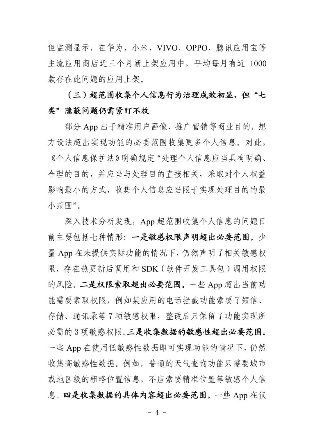 一是App收集使用个人信息总体状况。从9个方面进行态势分析和问题阐述,包括依法治理、强制收集、超范围收集、知情同意、隐私政策、明示告知、SDK收集、账号注销、社会监督等。