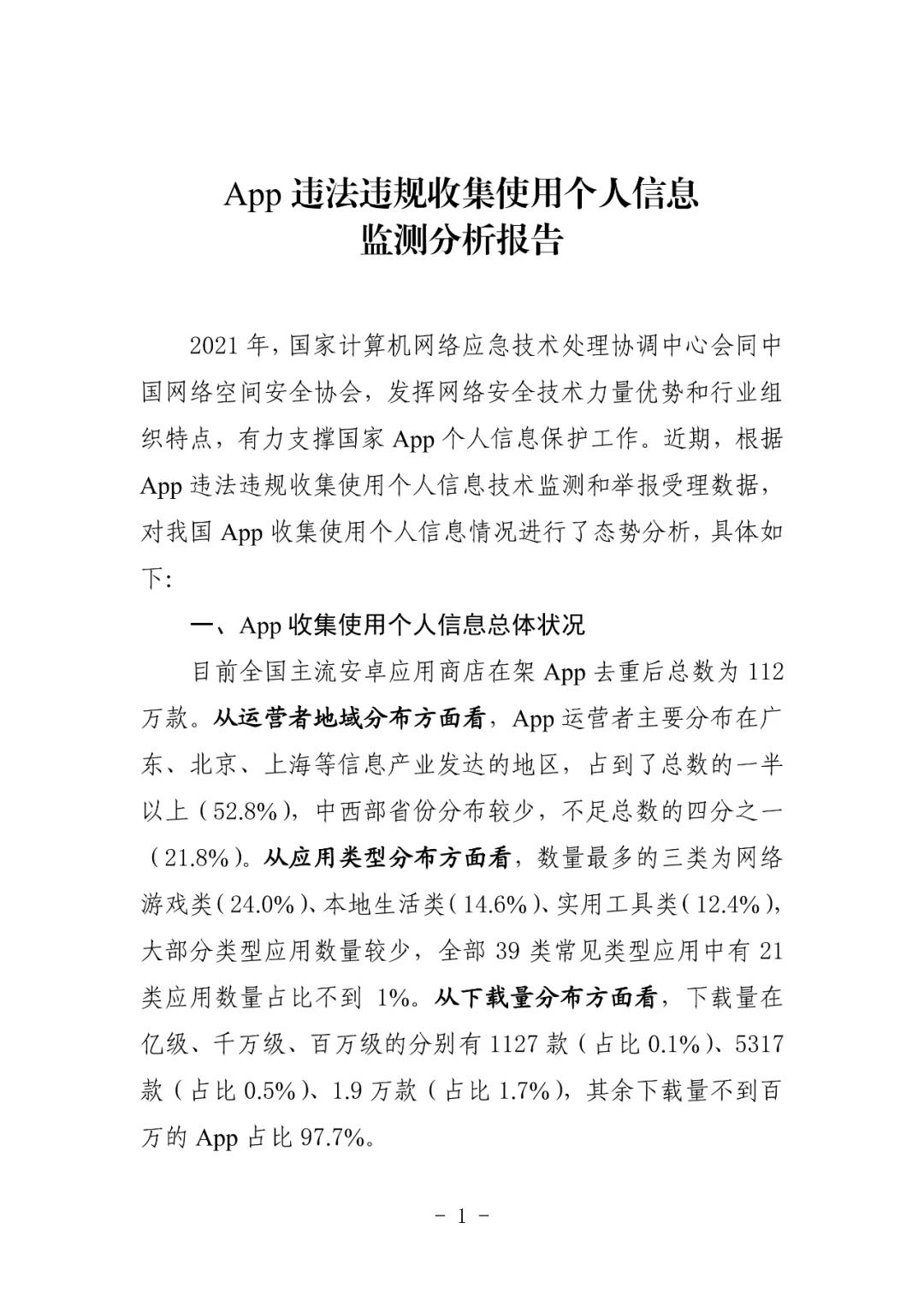 2021年,国家计算机网络应急技术处理协调中心(CNCERT)与中国网络空间安全协会共同建立了App收集使用个人信息监测平台、App举报受理平台。近期,CNCERT会同网安协会对前期专项治理和平台监测发现的App违法违规收集使用个人信息问题进行了总结梳理,对问题特点和趋势进行了深入分析,形成了关于App收集使用个人信息情况的监测分析报告。报告主要分为两个部分: