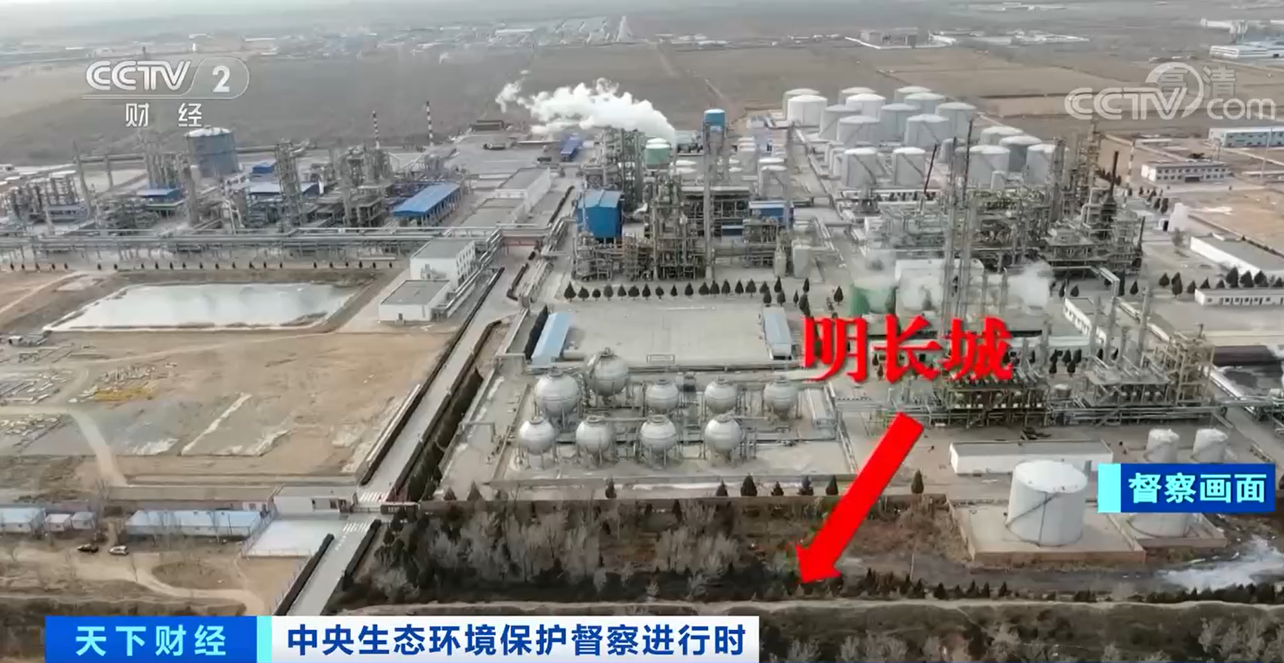 督察组还发现,工业园内的宁夏宁鲁石化公司紧邻头道边段明长城,甚至有400米就在厂区范围内。明长城盐池段是全国重点文物保护单位,自治区政府将墙体两侧50米确定为保护范围。盐池工业园2014年编制的总体规划环评也曾明确,“禁止在明长城两侧100米范围内建设建(构)筑物”。2014年后,宁鲁石化公司在明长城保护范围内违法新建炉渣库、甲醇储罐等工程,其中甲醇储罐距离明长城不足20米,严重威胁头道边段明长城安全。