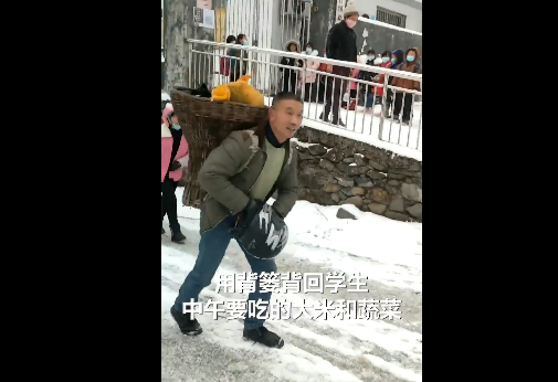 ·因大雪封路,陕西一老师走3公里用背篓背回食材,学生校门口排队欢呼。