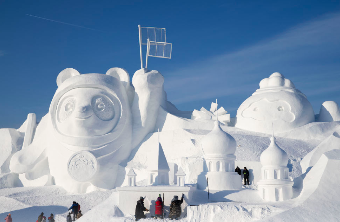 在太阳岛雪博会园区,工人对主雪雕“冬奥·太阳岛之旅”进行收尾作业,该雪雕长100米,高30米,用雪量2.7万立方米。