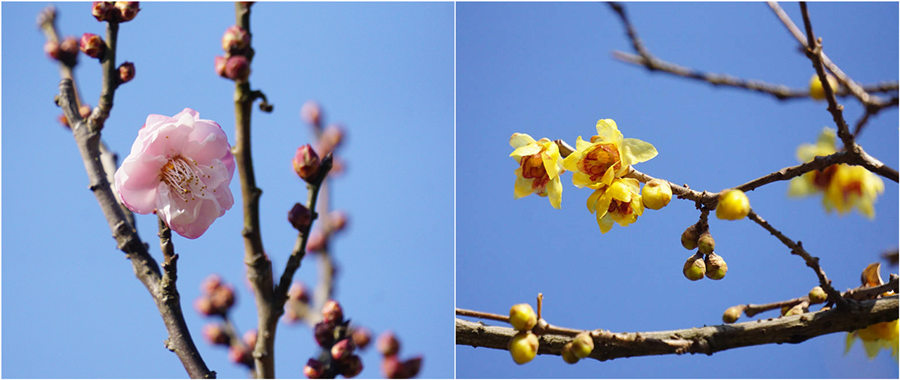 今年冬天,上海植物园的梅花和蜡梅出现了同时开花的罕见物候现象。