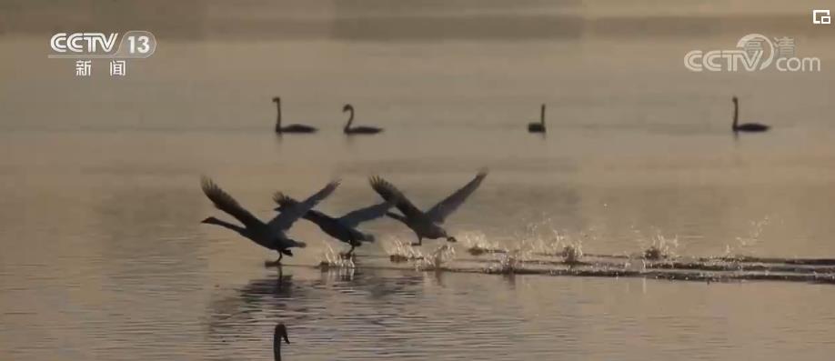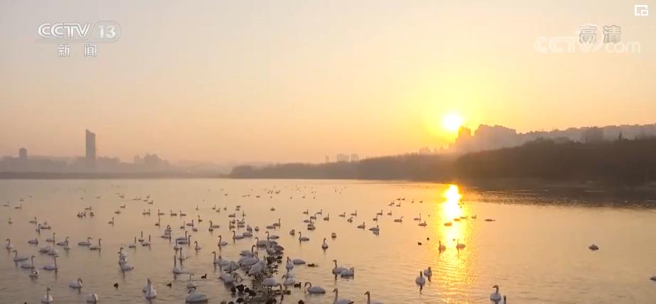 央视网消息:这里是位于黄河之滨的河南省三门峡市天鹅湖湿地。朝阳倒映于万顷澄碧之上,漾出一池碎金。上千只天鹅三五成群在这里飞翔嬉戏,形成难得一见的城市生态风景线。