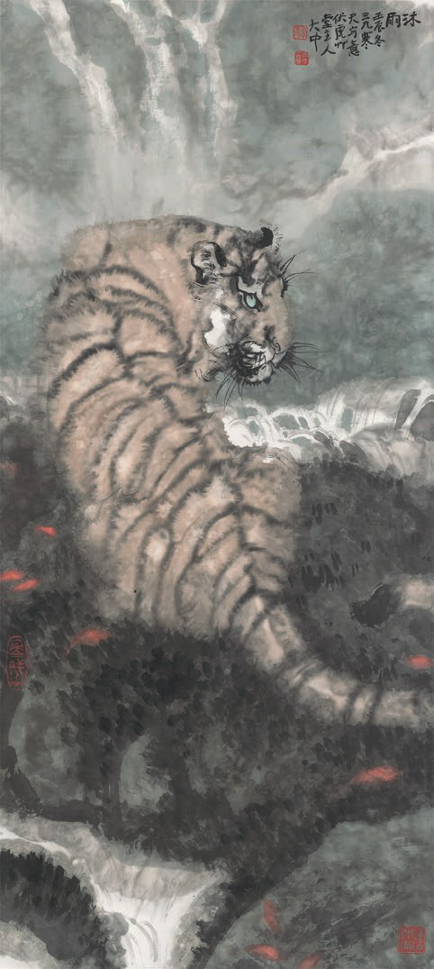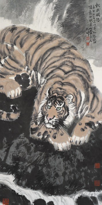 抽象首先要建立在知的基础上,认知可以通过思考或实践去达成。好的写意画家要么是具有超凡的感知力,且能心手相应。要么就是通过长期观察与实践,以渐悟方式获得抽象结果。或者如青藤白阳、八大山人那样天赋异禀,顿悟渐悟兼得。父亲深受苦学派影响,以勤补拙。工笔创作使他对于虎的生活习性、结构特点早已烂熟于胸。深藏心底那点儿诗人的感性使得写意虎的出现已经水到渠成。除了这个题材以外,他亦醉心于传统岁寒三友与墨荷的表现。这些都是他从李笑如先生那里继承的传统衣钵。