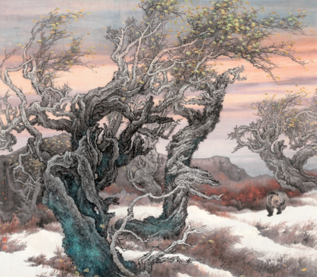 80年代初,冯大中在群雄并居的中国画界以山水画获全国美展银奖,显示出他在中国画笔墨语言方面的深厚基础。90年代他以《仙山品茗》画峨嵋,《长白细雨》画长白山秋雨,高山流瀑,烟云迷濛。我尤为喜爱《巫山云雨》一画,苍茫蕴藉,大气磅礴。《十月枫雪》一画写风雪迷漫,林海茫茫,一片天地洪荒之景。而《风月无边》一画,写雪中枯树,迎风挺立,有孤熊一只,望月独行,其间意境,于无言处显现真情。表明了冯大中在山水、花鸟、走兽等中国画领域全面的修养与功力。