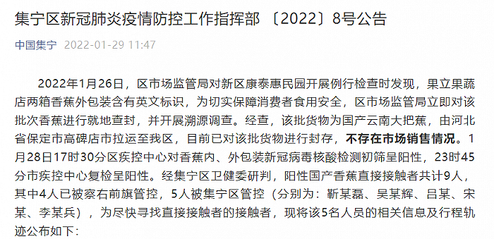 “中国集宁”微信公众号29日消息,集宁区新冠肺炎疫情防控工作指挥部通报,2022年1月26日,区市场监管局对新区康泰惠民园开展例行检查时发现,果立果蔬店两箱香蕉外包装含有英文标识,为切实保障消费者食用安全,区市场监管局立即对该批次香蕉进行就地查封,并开展溯源调查。经查,该批货物为国产云南大把蕉,由河北省保定市高碑店市拉运至集宁区,目前已对该批货物进行封存,不存在市场销售情况。1月28日17时30分区疾控中心对香蕉内、外包装新冠病毒核酸检测初筛呈阳性,23时45分市疾控中心复检呈阳性。经集宁区卫健委研判,阳性国产香蕉直接接触者共计9人,其中4人已被察右前旗管控,5人被集宁区管控(分别为:靳某磊、吴某辉、吕某、宋某、李某兵),为尽快寻找直接接触者的接触者,现将该5名人员的相关信息及行程轨迹公布如下: