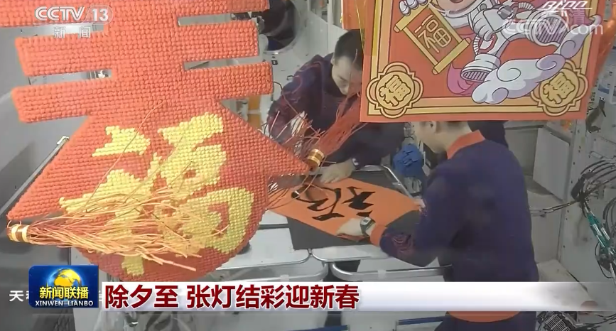 天地共迎虎年新春。除夕夜,在距地球400公里的中国空间站内,神舟十三号航天员穿上节日服,挂福字,迎新春,共同装扮天宫,这也是中国人首次在太空过春节。