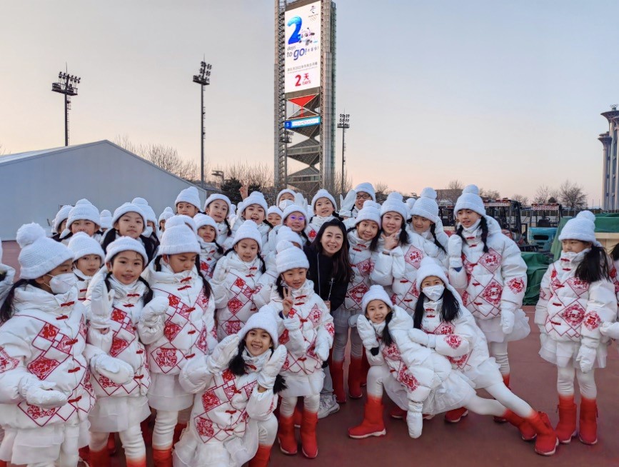 “小鸽子”莫柠瑞(黑衣服老师正后方)和同伴在冬奥会开幕式2天倒计时之际的合影。本文图片由北京小学提供