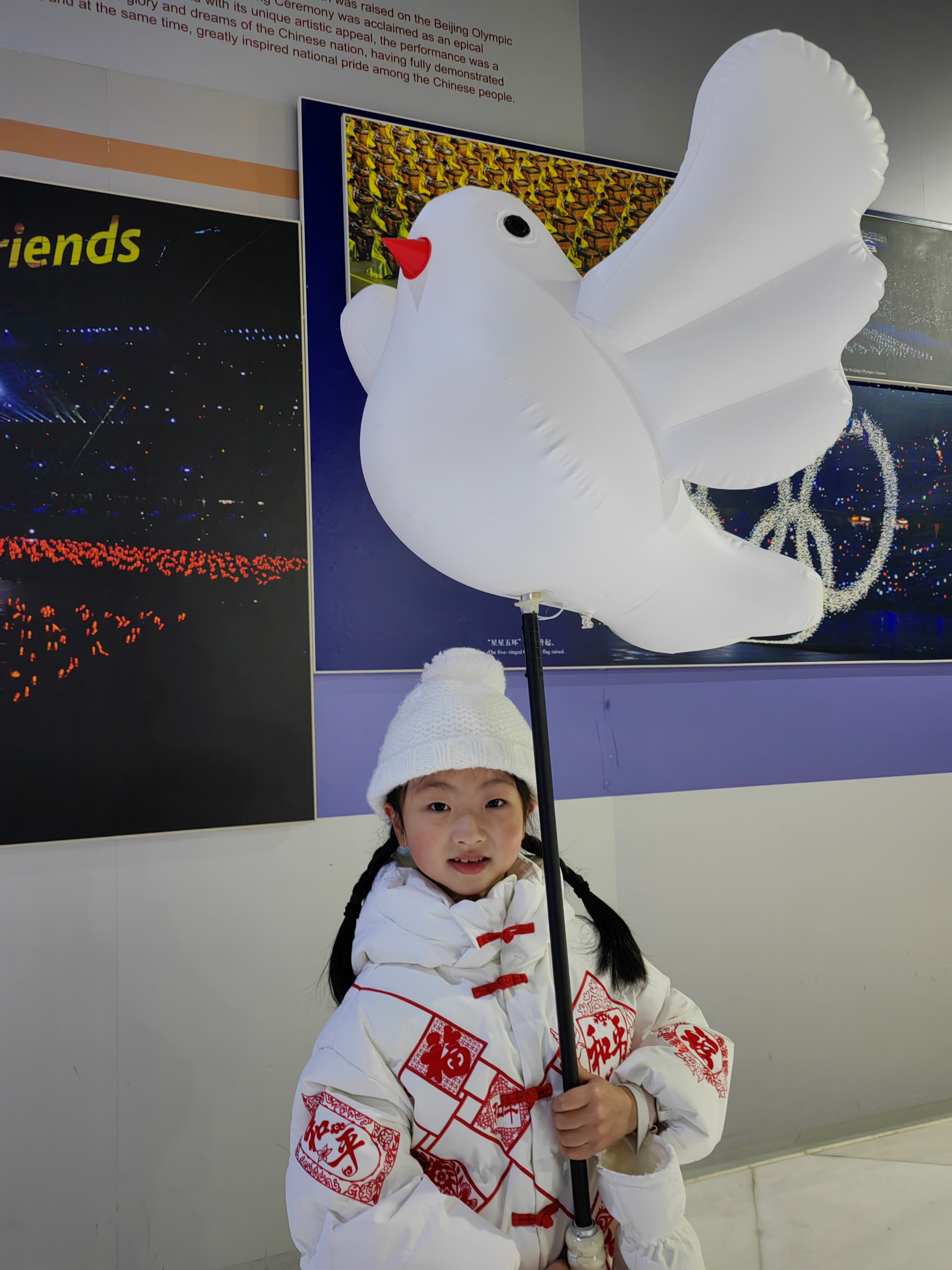 “有一次排练的时候天上下起雪了,特别冷,我们虽然戴着手套,但是手还是冻僵了。我们举的‘鸽子’是铁杆儿的,很沉、很冰,但我们一直坚持握着那个杆。”爱新觉罗·嘉萱回忆,当时地上还有雪,导演们怕她们摔倒,叫她们不要跑。