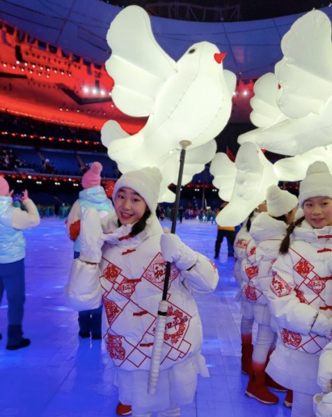 2月4日晚,在北京2022年冬奥会开幕式节目《闪亮的雪花》中,一只掉队的“小鸽子”被奔跑而来的“小鸽子”姐姐牵手带回“心”形队伍的画面温暖了很多人。
