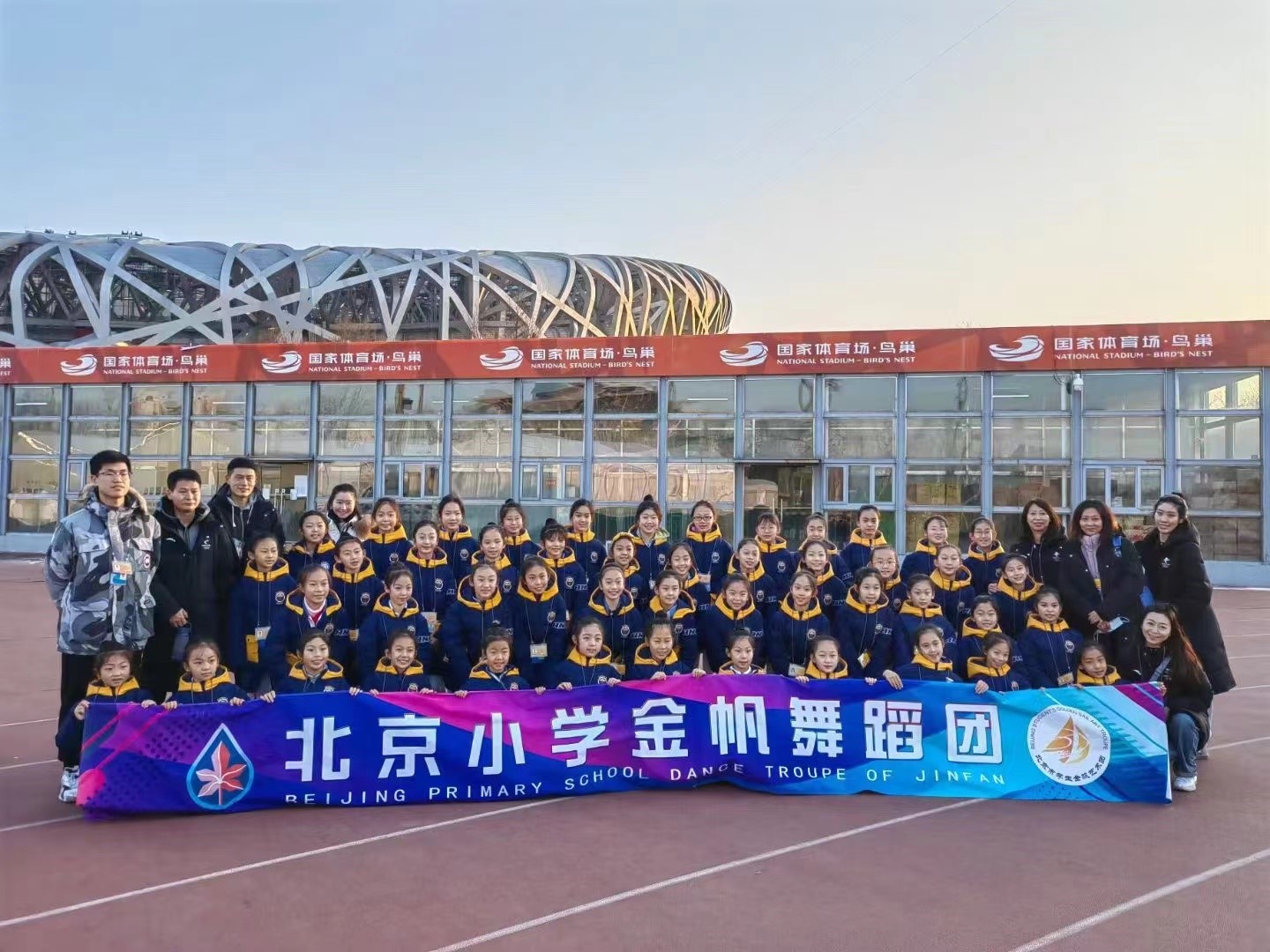 北京小学的“小鸽子”们在鸟巢外的合影。