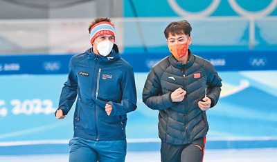 1月29日,国家速滑馆,中国速度滑冰队队员宁忠岩(右)与挪威选手一同热身。新华社记者 武 巍摄