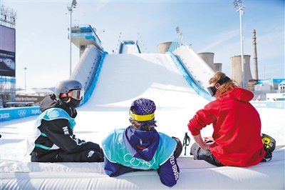 2月6日,首钢滑雪大跳台,3名选手在完成自由式滑雪大跳台训练后一起休息。本报记者 李 舸摄