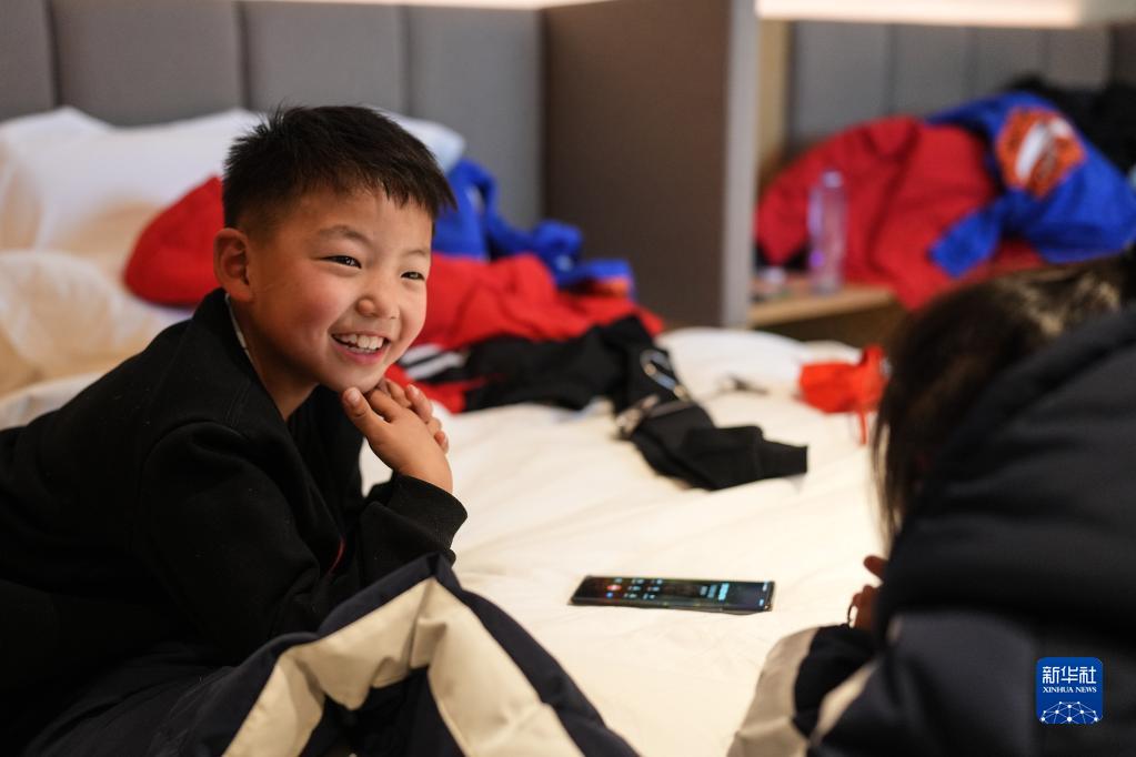 在酒店房间,马兰花儿童合唱团的孩子们给家人打电话(1月10日摄)。新华社记者 彭子洋 摄