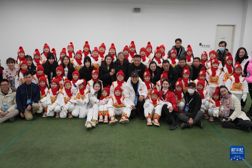 在国家体育场(鸟巢)后台,马兰花儿童合唱团的孩子们与总导演张艺谋(中)合影(1月15日摄)。新华社记者 许雅楠 摄